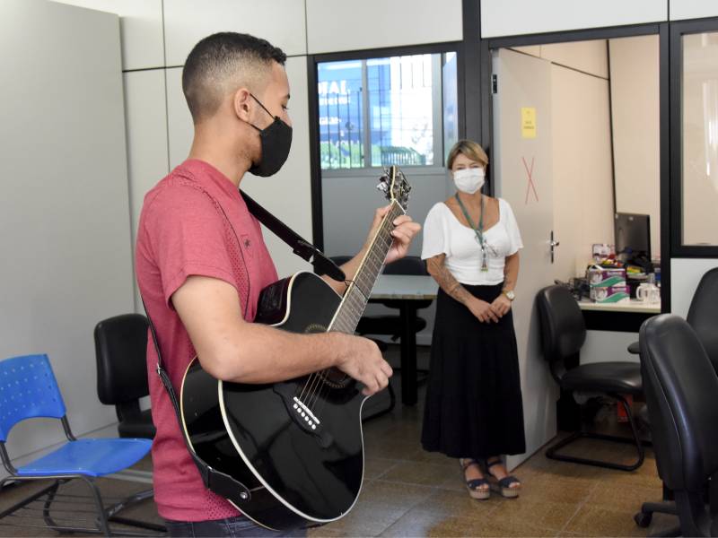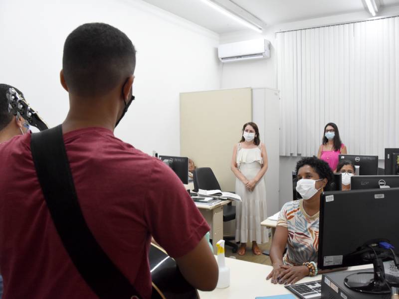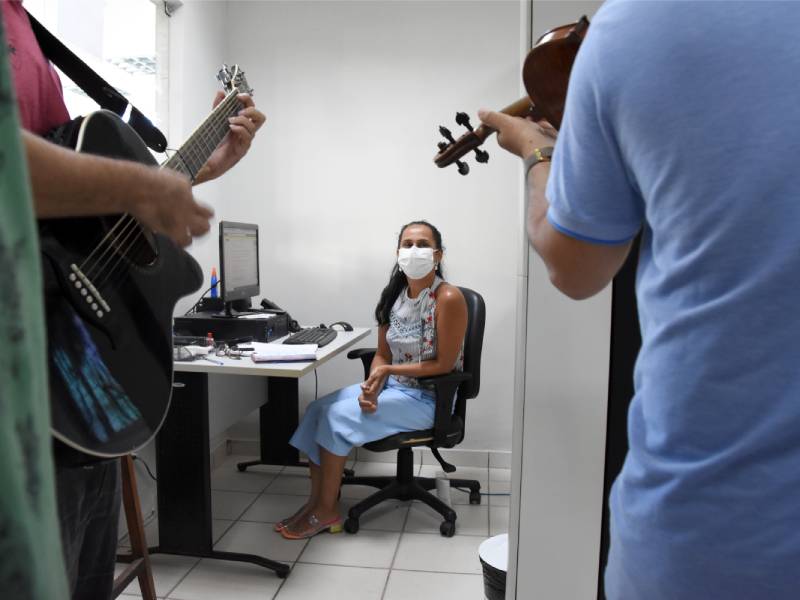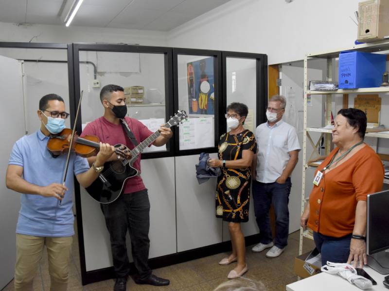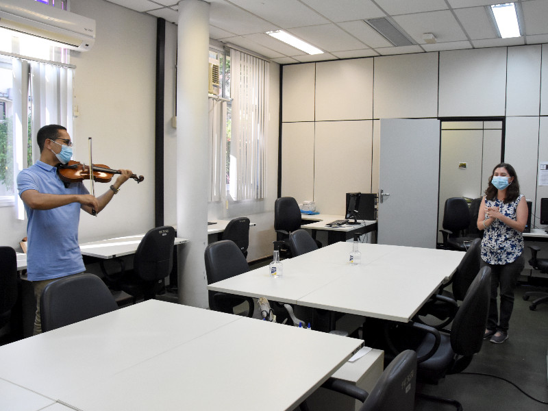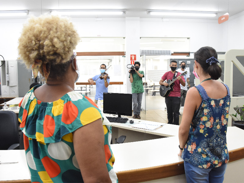 A homenagem do Campus Vitória para o dia 8 de março foi uma surpresa para as mulheres, preparada pela Diretoria-Geral. O regente da Orquestra Acadêmica do Ifes, professor Walter Costa Bacildo, e seu filho, Ryan Lima Bacildo, surpreenderam as servidoras nos seus ambientes de trabalho, ao som do violino e do violão.