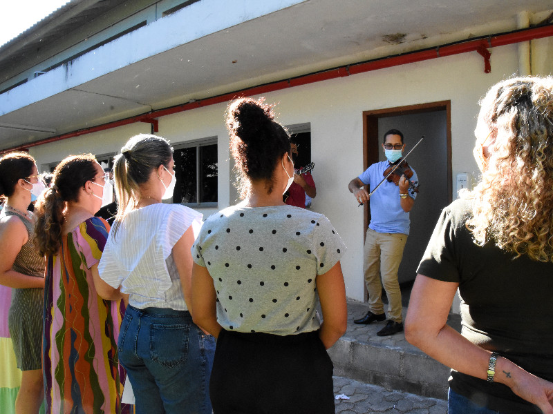 A homenagem do Campus Vitória para o dia 8 de março foi uma surpresa para as mulheres, preparada pela Diretoria-Geral. O regente da Orquestra Acadêmica do Ifes, professor Walter Costa Bacildo, e seu filho, Ryan Lima Bacildo, surpreenderam as servidoras nos seus ambientes de trabalho, ao som do violino e do violão.